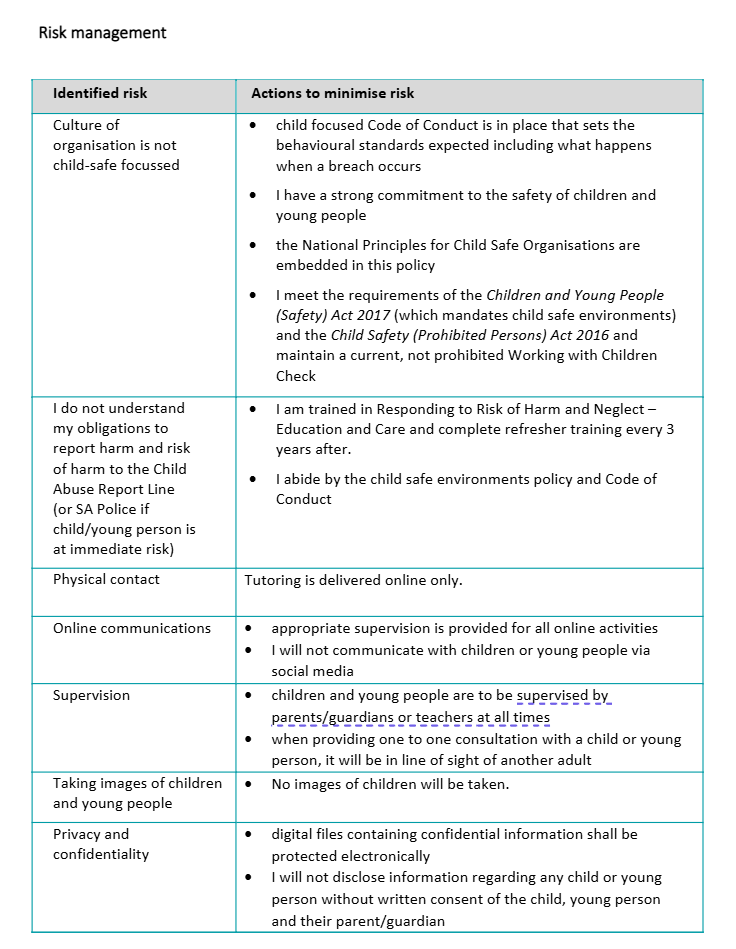 I am committed to providing a safe environment to all children and young people. My policy complies with the Children and Young People (Safety) Act 2017, the Child Safety (Prohibited Persons) Act 2016 and aligns with the National Principles for Child Safe Organisations.